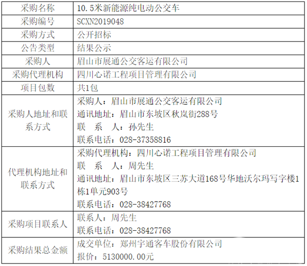 四川省眉山市展通公交客运公司10.5米新能源纯电动公交车采购结果公告