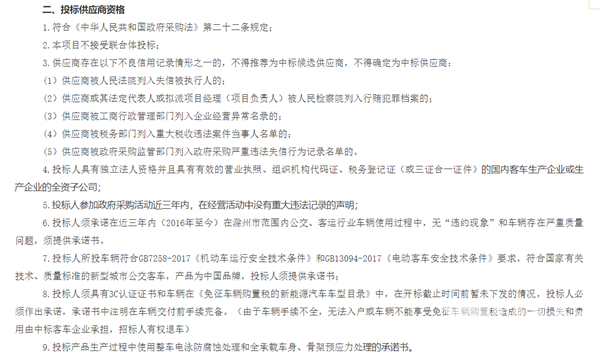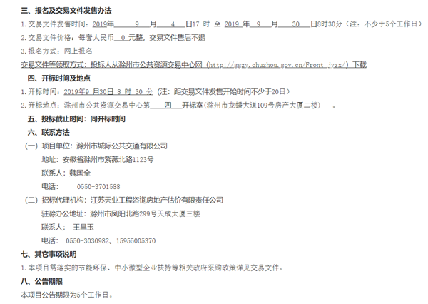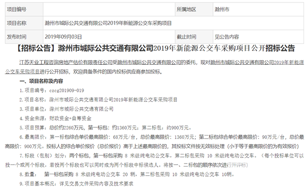 安徽省滁州市城际公共交通有限公司2019年新能源公交车采购项目招标公告