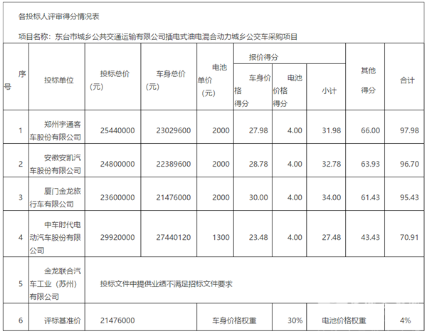 江苏东台市城乡公交运输公司插电式油电混合动力城乡公交车采购中标公告