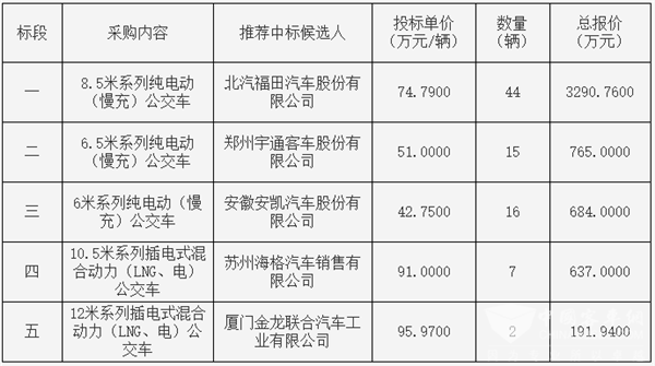 本招标项目嘉兴市公共交通有限公司城乡公交车采购项目已于2019年11月4日09时30分开标。经评标委员会综合评定,现推荐各标段中标候选如下:
