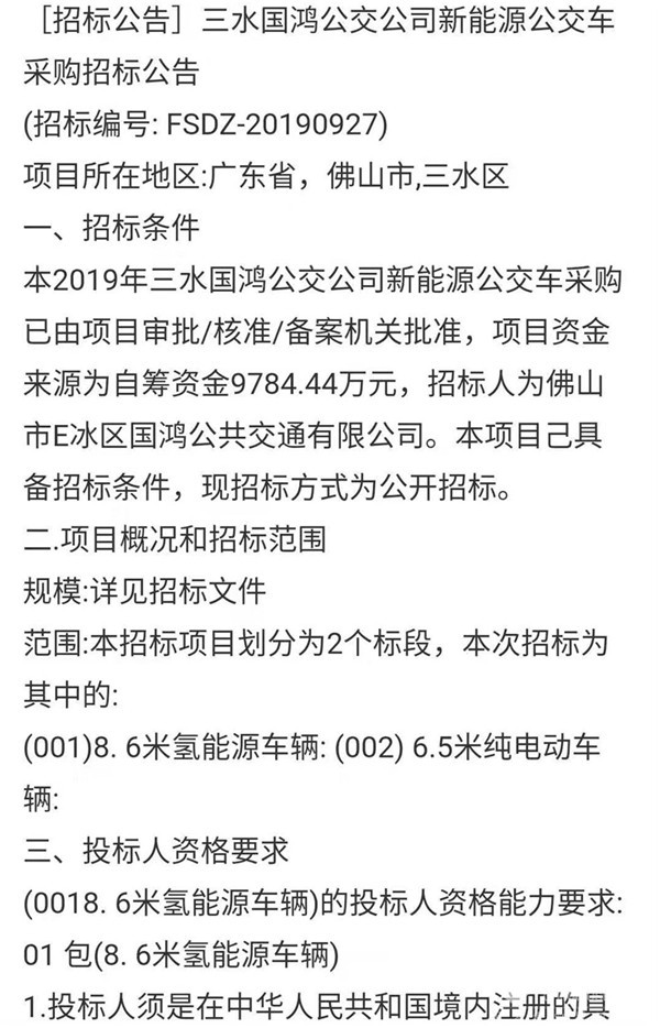 广东省佛山市三水国鸿公交公司新能源公交车采购招标公告