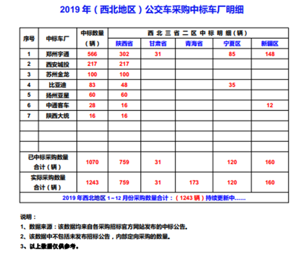 2019年(西北地区)城市公交车采购招标信息表