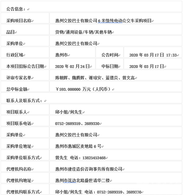 惠州市建佳造价咨询事务所有限公司受惠州交投巴士有限公司的委托,就“惠州交投巴士有限公司6米级纯电动公交车采购项目”项目(项目编号:HZJJ-2020007号)组织采购,评标工作已经结束,中标结果如下: