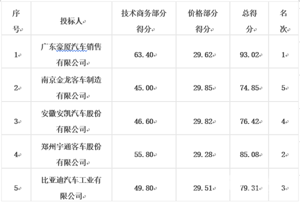 备注:经项目评标委员会评审,按各投标人的总分由高至低排序,向惠州交投巴士有限公司提交本项目的评标结果,并由采购人依法确定中标人。