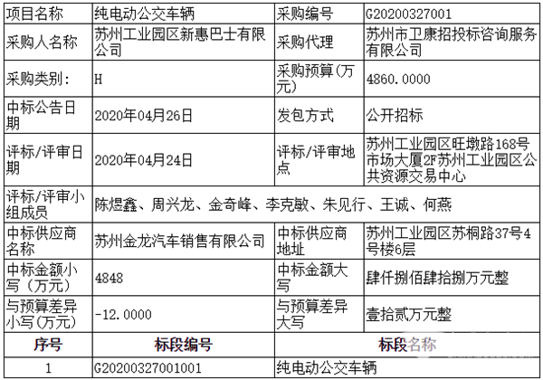 苏州工业园区新惠巴士有限公司纯电动公交车辆中标公告