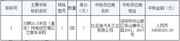 宁波市国际招标有限公司就宁波市城乡公共交通有限公司33辆10.5米级(直流)纯电动空调公交客车采购项目进行公开招标采购,经过评标委员会评审,现将采购结果公告如下: