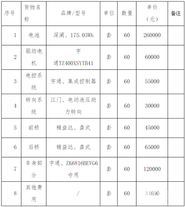 主要中标或者成交标的的名称、规格型号、数量、单价、服务要求:8米—8.3米纯电动公交车