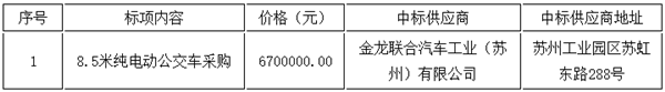 浙江省乐清公交客运有限公司8.5米纯电动公交车采购中标结果公告