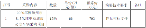 浙江省嵊州市公交公司2020年度嵊州市8.5米纯电动城市公交车采购招标公告