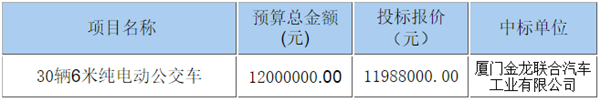 浙江省温州交运集团汽车服务有限公司30辆6米纯电动公交车中标公告