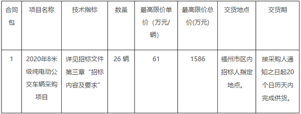 福建省福州华威公交巴士有限公司2020年8米级纯电动公交车采购招标公告