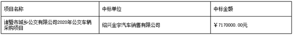 一、公告名称:诸暨市城乡公交有限公司2020年公交车辆采购项目中标结果公告