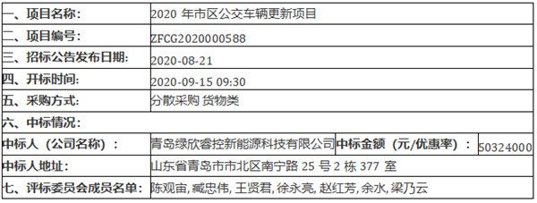 青岛市交通运输局2020年市区公交车辆更新项目中标公告