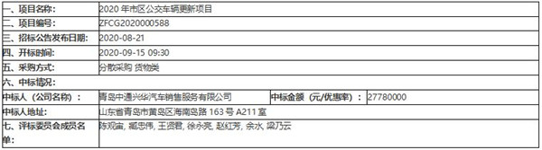 青岛市交通运输局2020年市区公交车辆更新项目中标公告
