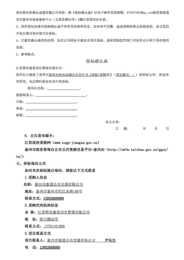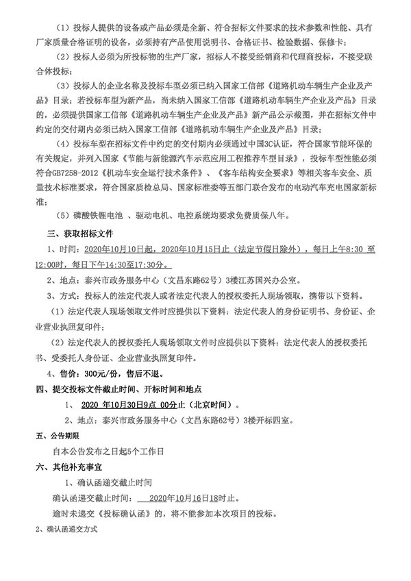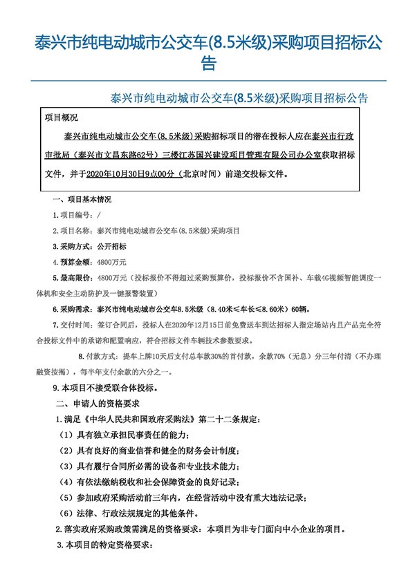 江苏省泰兴市泰通公交公司纯电动公交车采购项目招标公告