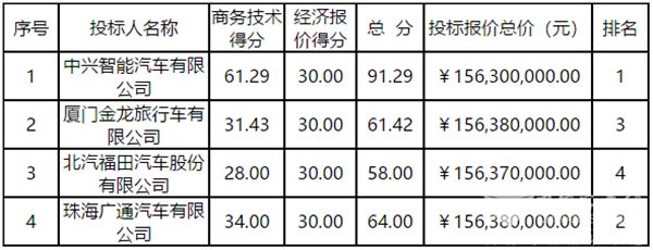 1、第一中标候选人:中兴智能汽车有限公司。