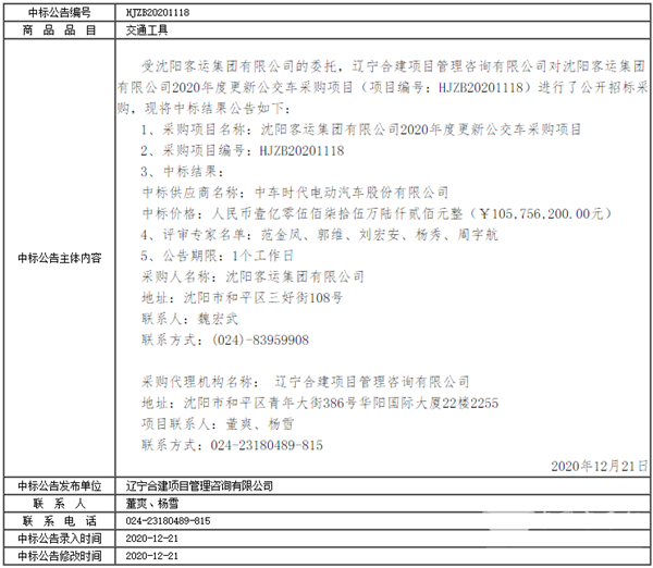 辽宁省沈阳客运集团有限公司2020年度更新公交车采购项目中标公告
