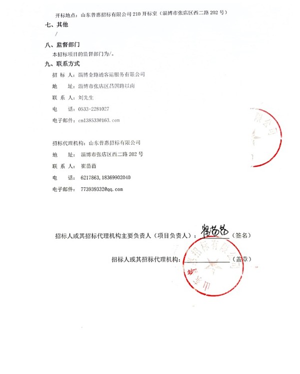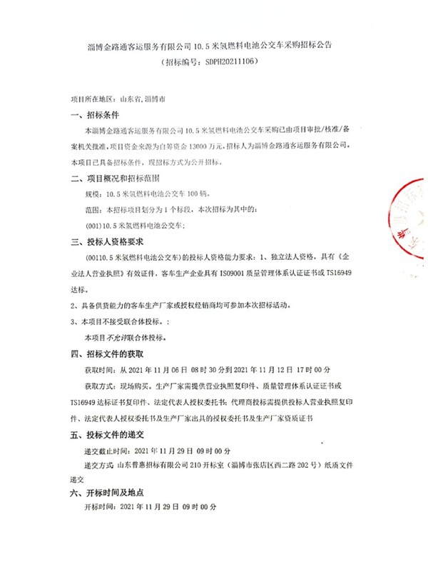 淄博金路通客运服务有限公司10.5米氢燃料电池公交车采购招标公告
