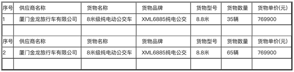 2、中标人情况:合同包一中标人为:厦门金龙旅行车有限公司;代理服务费为:183732.5元。合同包二中标人为:厦门金龙旅行车有限公司;代理服务费为299108.75元。
