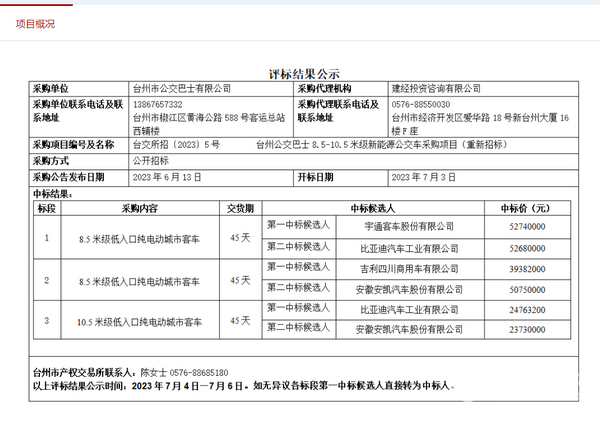 项目名称:台州公交巴士8.5-10.5米级新能源公交车采购项目(重新招标)评标结果公示