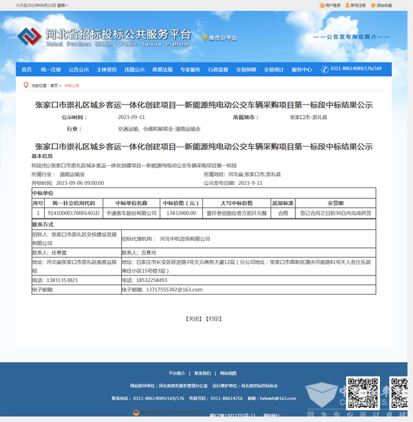张家口市崇礼区城乡客运新能源纯电动公交车采购第一标段中标结果公示