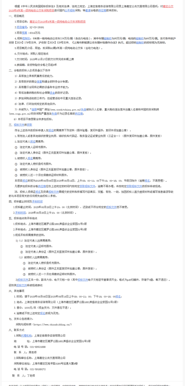 - 奉化区公共交通有限公司2025年度22辆纯电动公交车采购项目的公开招标公告