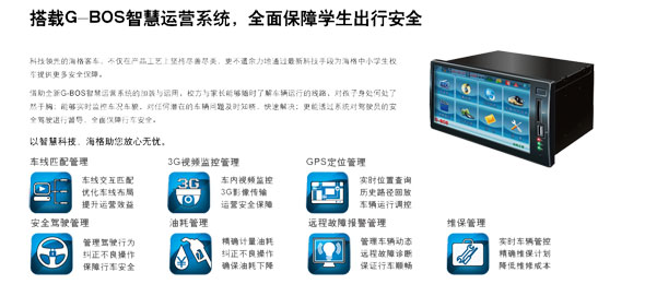 海格快乐校车及时开发并向芒果V基金捐赠了G-BOS校车实时监控系统。运用这个系统,其行驶状态和车辆状况等信息,都可以通过网络进行实时监测。