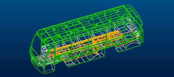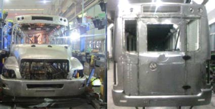 海格智慧安全校车全部采用金属冲压前后围,碰撞安全性更好。左图为金属冲压前围,右图为金属冲压后围。