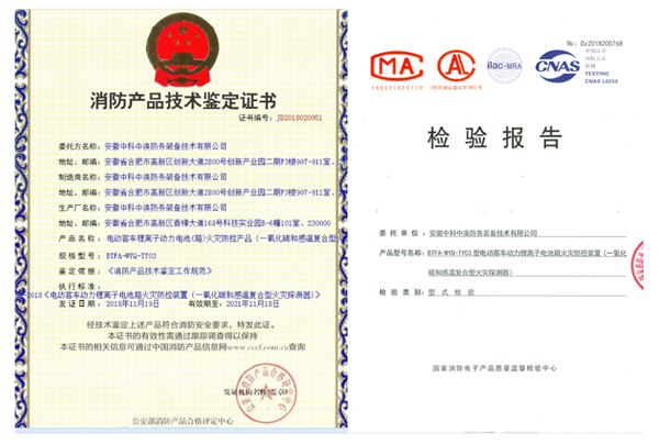 作为首家送样到沈阳消防所研究中心的企业,中科中涣电动客车动力锂离子电池箱火灾防控装置率先满足相关的技术鉴定条目。并于2018年9月26号完成型式检验,并取得型式检验报告,2018年11月19日获得国家应急管理部消防产品合格评定中心颁发的消防技术鉴定证书(证书编号: JD2018020051)。